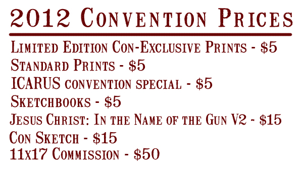 Emerald City is this weekend, so I thought I would put up my 2012 price list. Other cons scheduled this year are ACME – Arizona Mini Comic Expo, Phoenix Comic-Con, & ACE – Albuquerque Comic Expo.