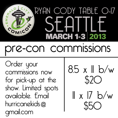 Emerald City, here I come. February 5, 2013 ~ ryancody Once again, I’ll be a guest at the ever-amazing, Emerald City Comicon. I’m taking pre-show commissions to help with travel costs. Share this: Click to share on X (Opens in new window) X Click to share on Facebook (Opens in new window) Facebook Like Loading... Related